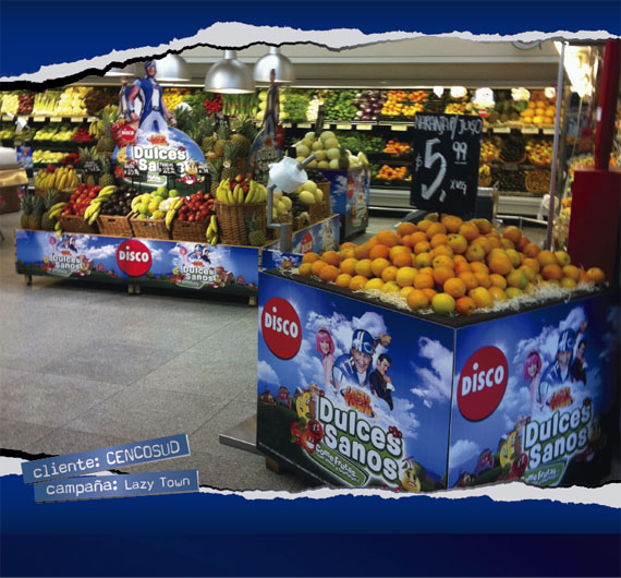 Corpóreos en mdf y fajas en alto impacto ruteado para realzar la zona de verdulería en varios supermercados.
