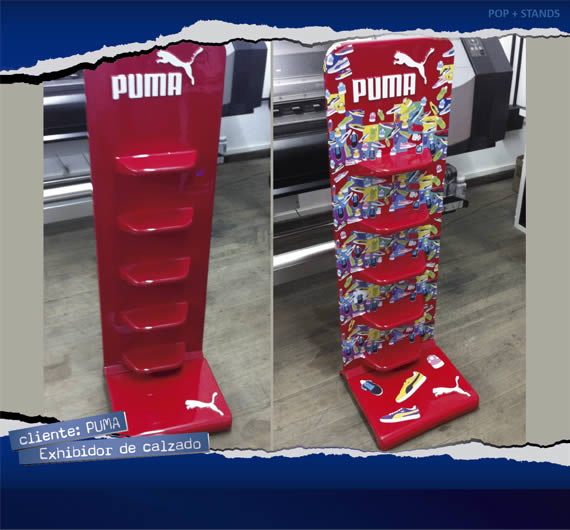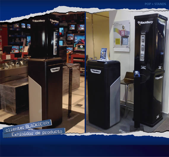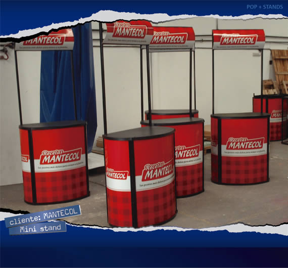 Mini stands para promoción de producto, con estructura de hierro y plástico termoformado. Aplicación de gráfica impresa.